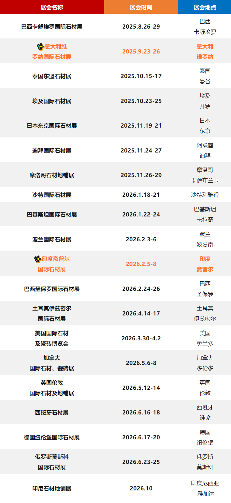 2025 - 2026 年全球石材展會版圖已就位!從巴西卡舒埃羅開啟石材之旅,意大利維羅納、泰國曼谷等多地接力 。涵蓋石材全品類,從基礎(chǔ)石材到地鋪、瓷磚關(guān)聯(lián)品類 。無論你是石材企業(yè)拓展海外市場,還是采購商尋覓優(yōu)質(zhì)資源,在巴西圣保羅看行業(yè)前沿,去美國奧蘭多探跨界融合 。不同國家展會各有特色,精準(zhǔn)對接全球石材產(chǎn)業(yè)鏈,跟著這份排期,奔赴一場場石材行業(yè)的國際盛宴,搶占全球市場先機(jī)!