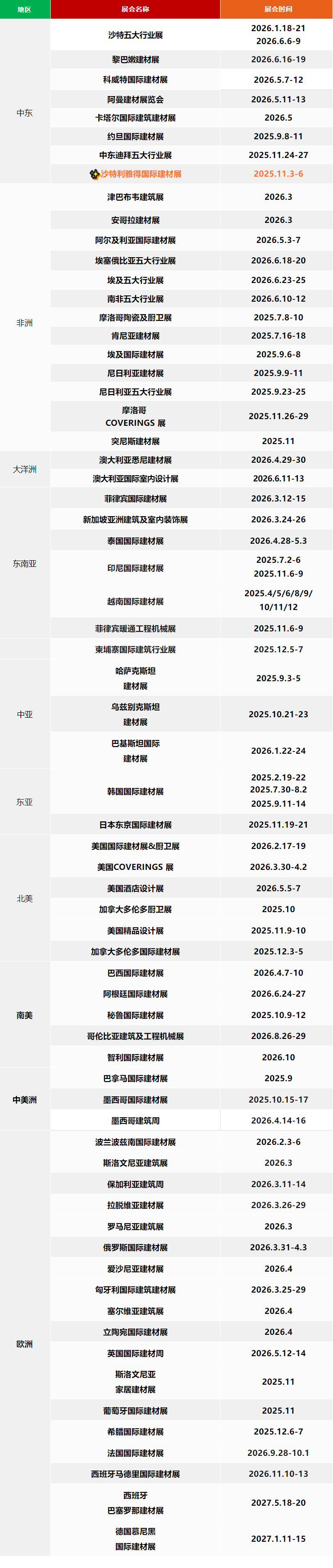 從德國BAU 的歐洲最大建筑展,到 美國國際建材展&廚衛(wèi)展的住宅建筑標(biāo)桿,再到沙特利雅得國際建材展的千億級基建市場——2026年全球重磅建材展會,覆蓋綠色建材、智能建造、裝配式技術(shù)、設(shè)計趨勢 全領(lǐng)域!
