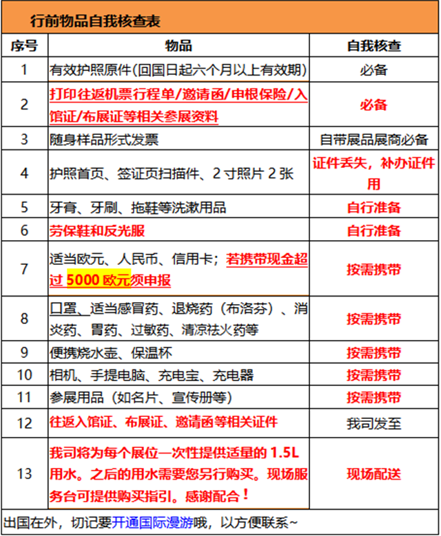 ② 打印版:往返機票行程單、申根保險、入館證 / 布展證(丟失需補購€53 / 人)、邀請函、隨身樣品形式發(fā)票(帶樣品展商必備)