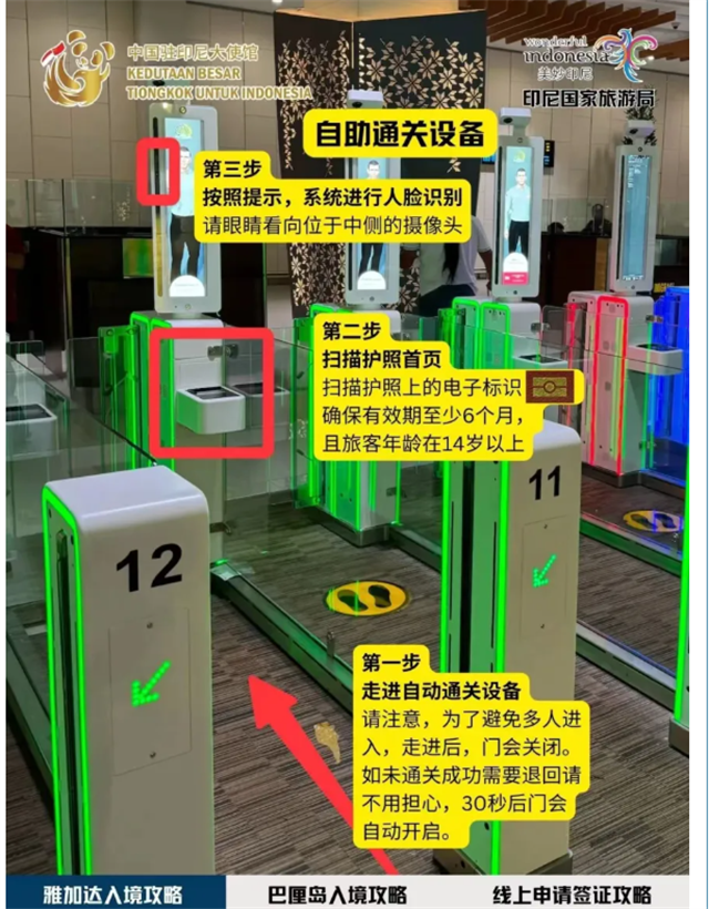2、印尼入境:自助通關設備已落戶雅加達和巴厘島國際機場,電子簽或電子落地簽持有者可由此入境,最快僅需10秒就能輕松通關。免去人工窗口排隊,絲滑入境。注意,14歲以下兒童仍需前往人工通道入境。